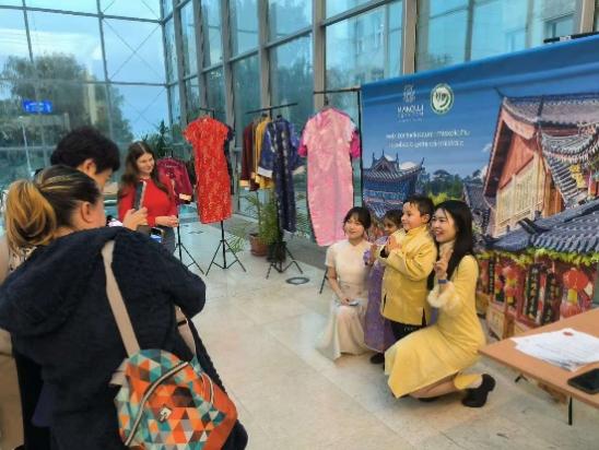 试穿中国传统服饰的展位前始终熙熙攘攘,成为当晚最热门的体验项目之一。不同年龄的宾客们都聚集在此,在志愿者们的热情协助下挑选并试穿心仪的汉服或旗袍。许多人在穿戴整齐后,情不自禁地以会场为背景拍照留念,沉浸于这跨越时空的文化体验之中。